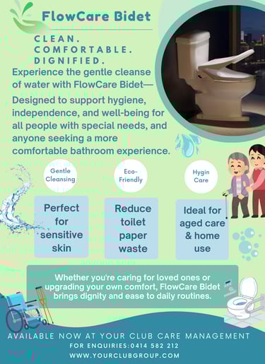 Your Club provides bathroom bidet units for aged care residents, offering enhanced hygiene, comfort, and dignity. Our bidet solutions support independent living while promoting better health and well-being.