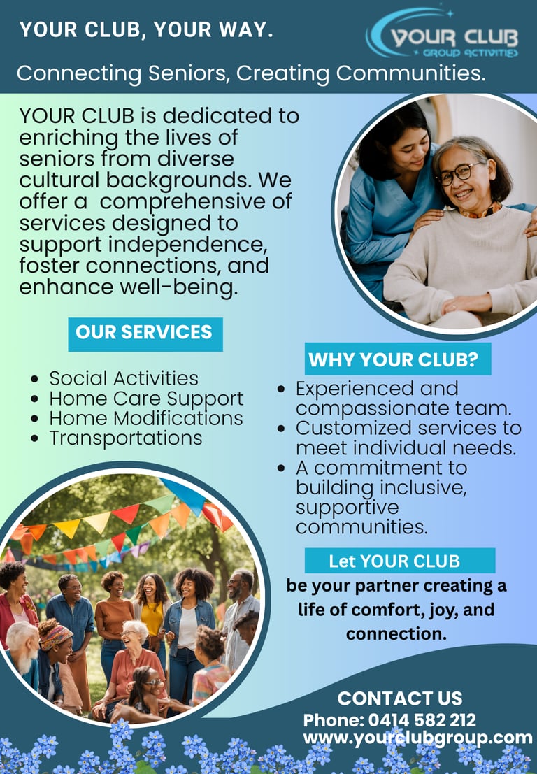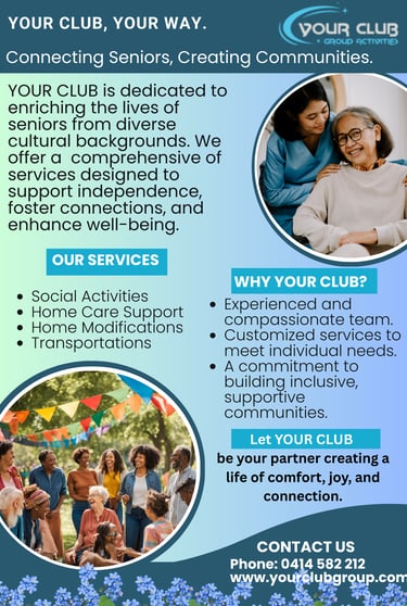 At YOUR CLUB Care Management, we aim to provide compassionate, personalised, and high-quality home care services that empower seniors to live independently and with dignity. We are dedicated to fostering connections across diverse cultural backgrounds and creating a supportive environment where everyone feels valued and respected. Through our commitment to excellence, we strive to enhance the well-being and quality of life for those we serve, ensuring comfort, safety, and peace of mind in the home they cherish.